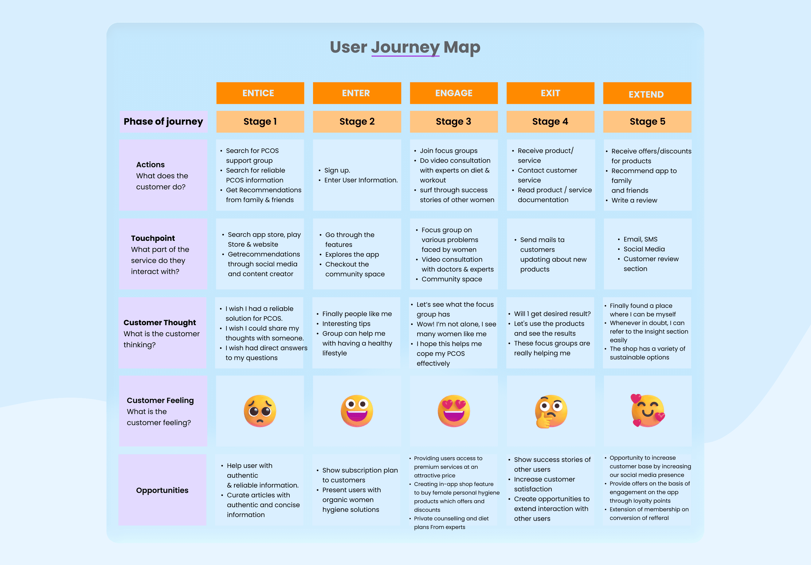 Building on the insights from user research, I created a detailed User Journey Map to understand how users interact with Heather at every stage of their experience. This visual framework captures user actions, thoughts, feelings, and touchpoints — from initial awareness to ongoing engagement. By mapping these stages, I was able to identify emotional highs and lows, uncover unmet needs, and spot opportunities for design interventions that deliver clarity, empathy, and long-term value.